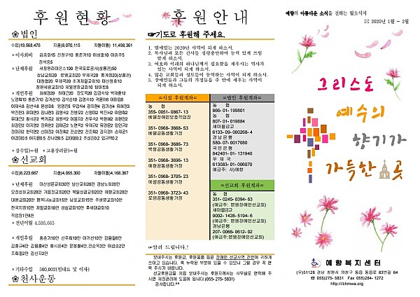 예향 소식지 2020년 1월~2월 입니다^^ 페이지 정보 작성자 예향 작성일2020-04-22 13:08 조회6,325회 댓글0건 이전글 다음글 목록 본문 댓글목록 등록된 댓글이 없습니다. 이전글 다음글 목록